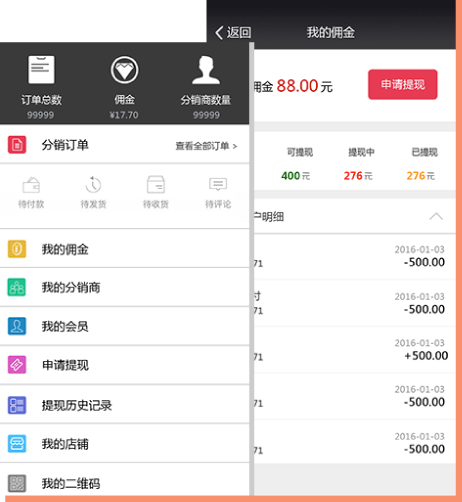 佣金系统?全新升级!智能返佣,释放双手!支持银行卡、微信红包、商城余额等多种提现方式,智能判断返佣,方便快捷解决资金变现问题。